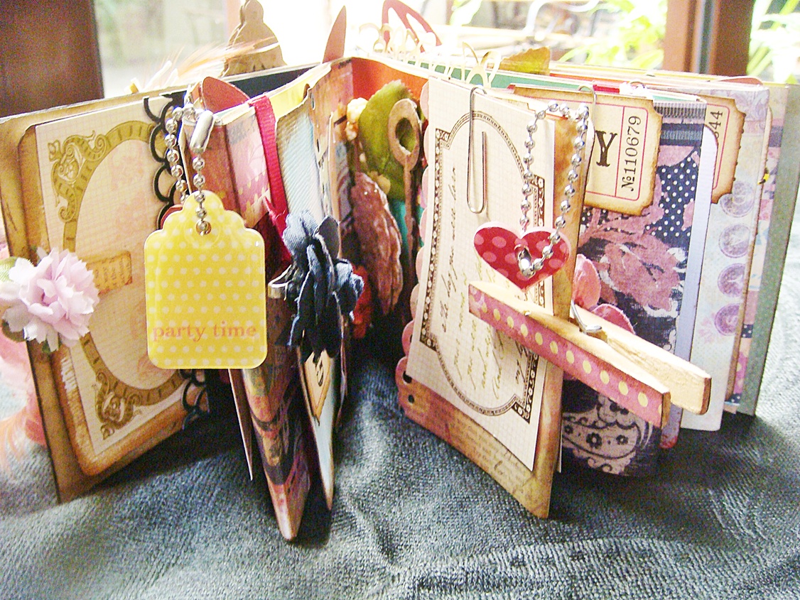Out of the many mini albums i've created gotta say this one is my fav!!! Why? because it's pack with personal items that i managed to find in my accesories box n in the house. Wud u believe it if i say the flowers on the front cover was actually part of my hair clip?. Yeah..i rip it apart cos i love the feathers so much! lol. There's also a black rose hairpin from evita peroni, wooden cloths peck that i covered with pp, office documents clips, i even dismantle my kids keychains to get the silver chain..hehehe and finally a hair band to tie it together.